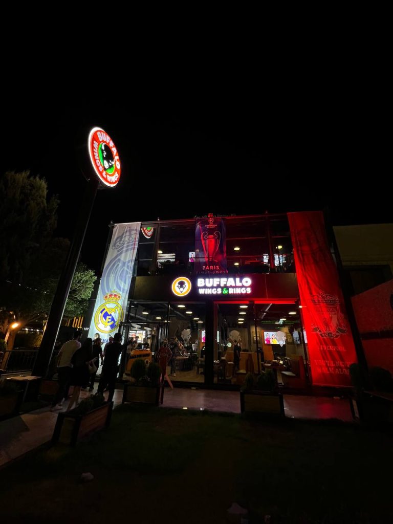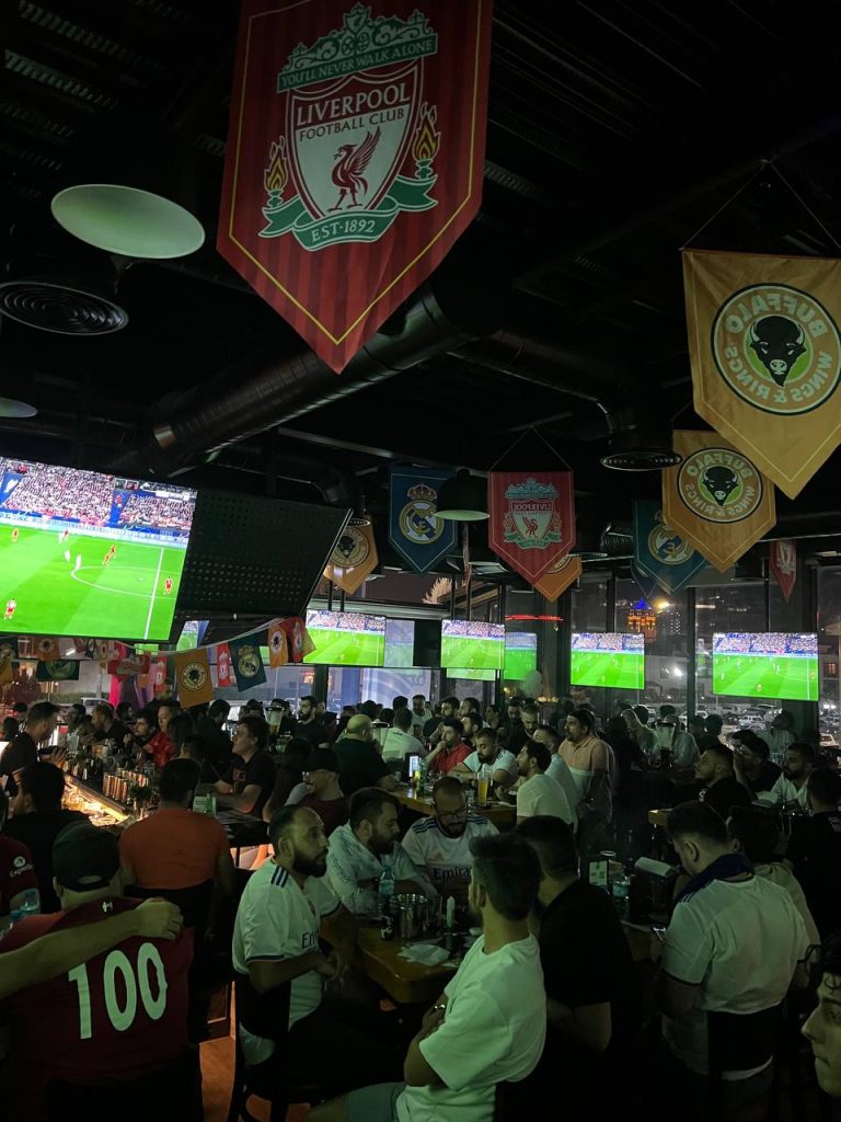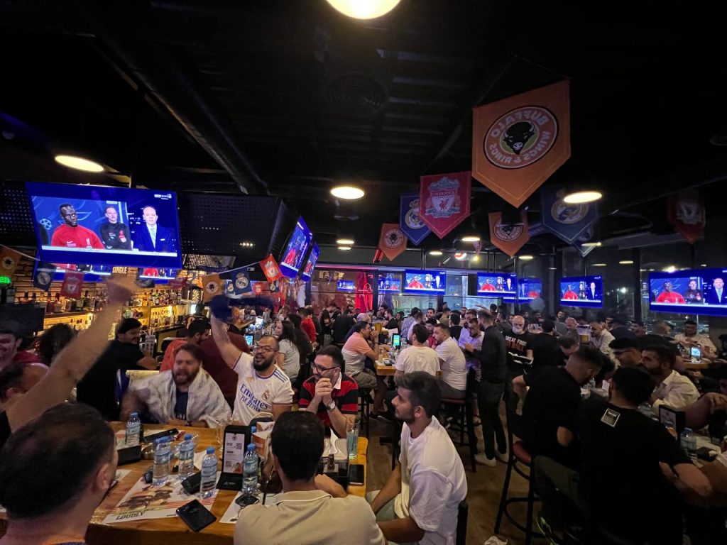 Where else to go to watch the final!!! Buffalo Wings & Rings Erbil have made the final magical touch for the biggest match in the international football Real Madrid vs Liverpool, with a fully decorated store starting from the giant flags at the entrance to the great team who joined the fans their excitement and ending with the winning celebrations. Congratulations to Real Madrid who earned the trophy and hard luck to Liverpool fans.